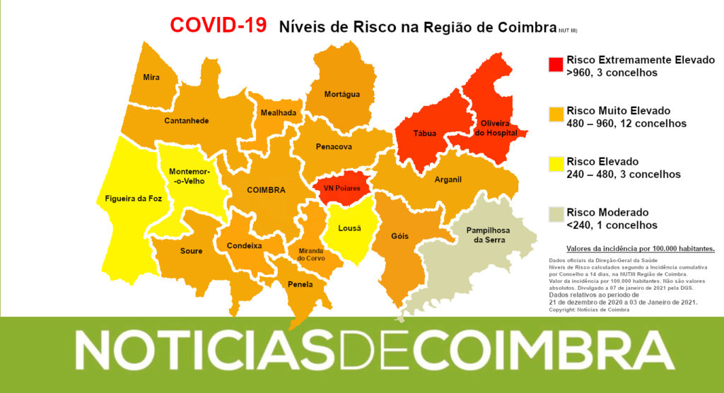 A Região de Coimbra agravou o risco de contágio da covid-19, segundo os dados divulgados hoje pelo Governo, e tem três concelhos em Risco Extremamente Elevado, Oliveira do Hospital, Tábua e Vila Nova de Poiares, e doze em Risco Muito Elevado, incluindo Coimbra. As medidas entraram em vigor às 00h00 de 8 de janeiro.