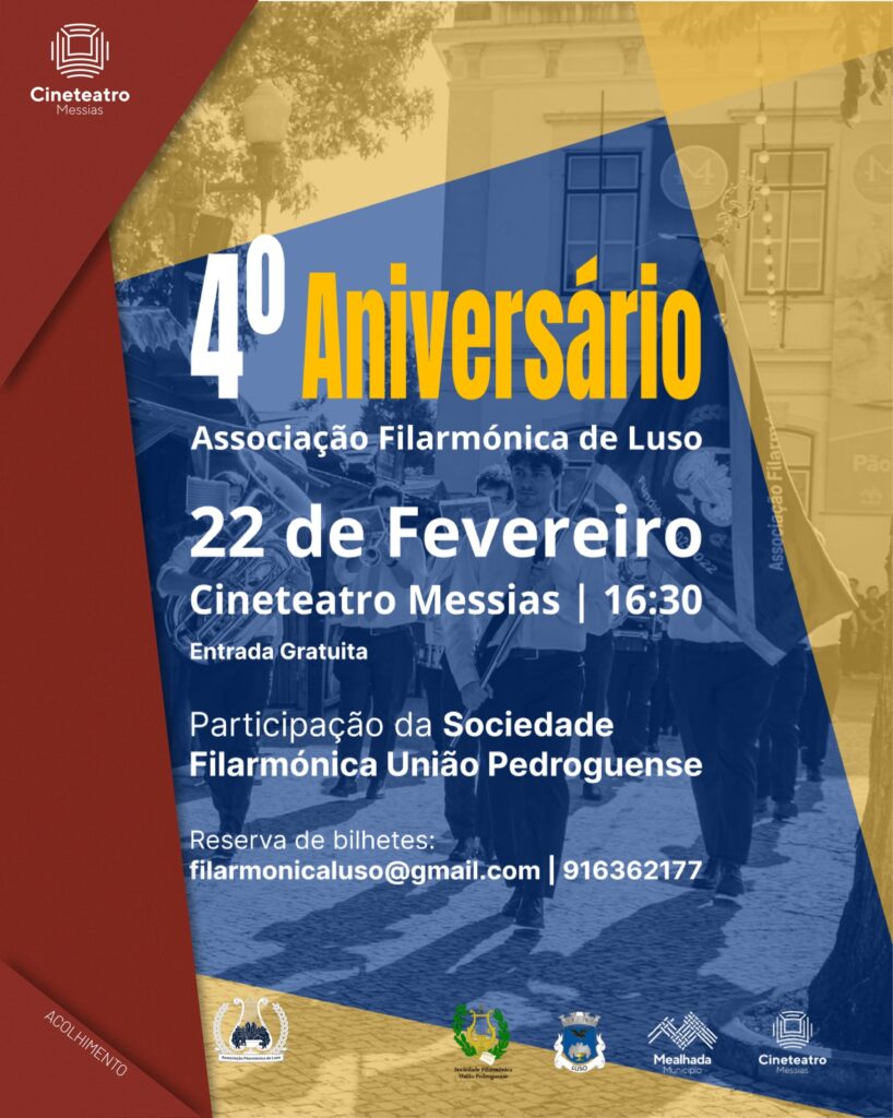 A música também faz parte das propostas na sede de concelho. No domingo 22 de fevereiro, pelas 16:30, o Cineteatro Messias recebe o espetáculo que assinala o 4º aniversário da Associação Filarmónica do Luso.