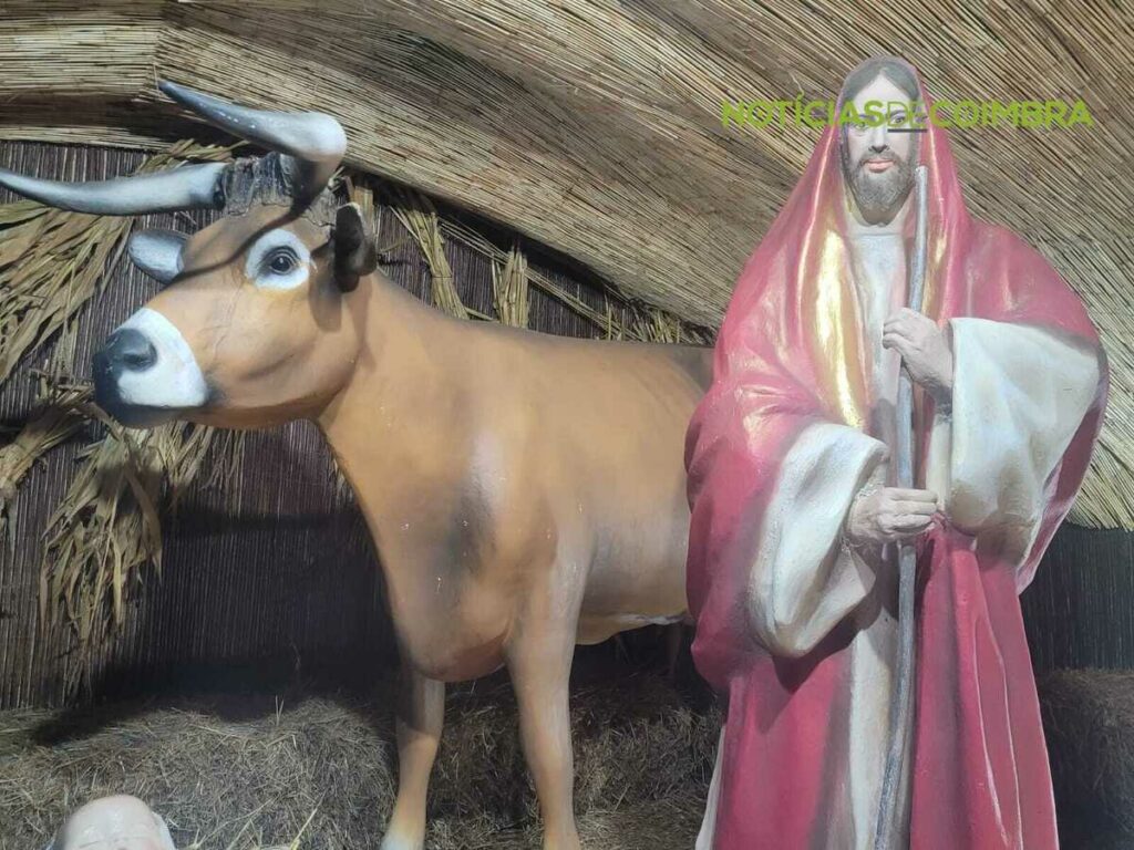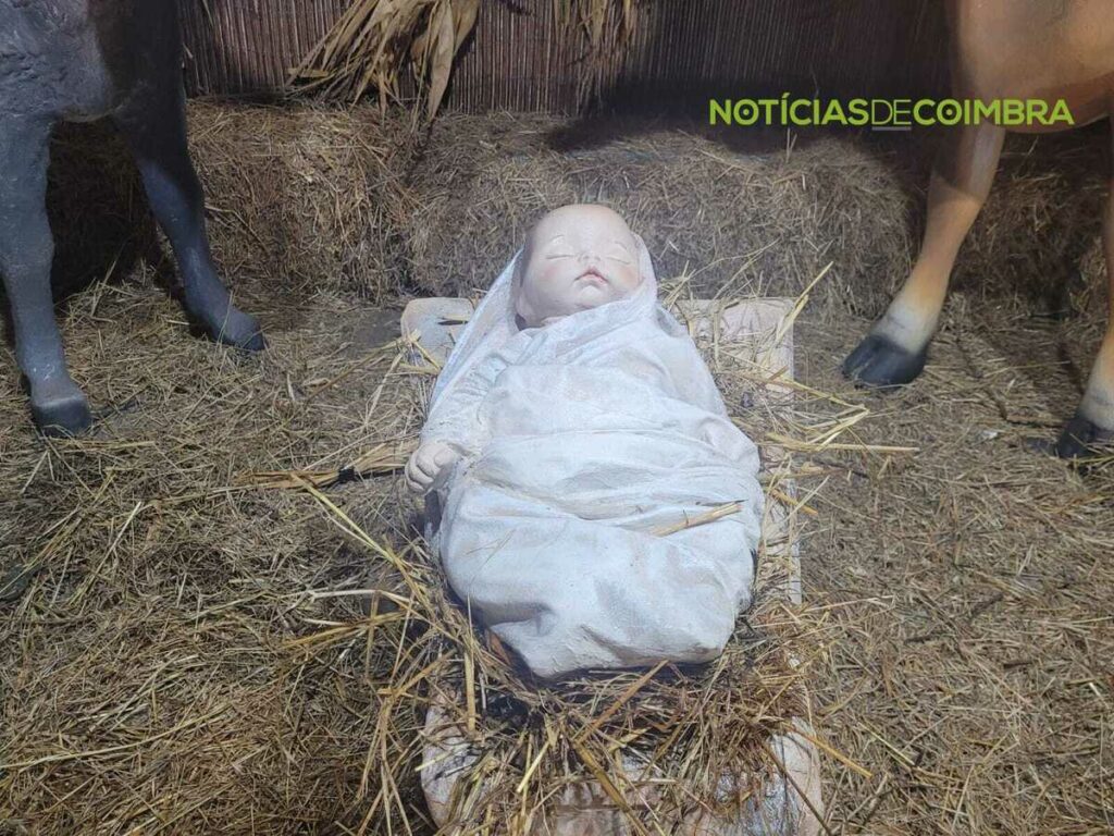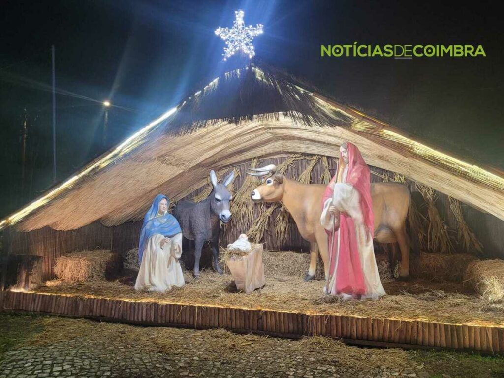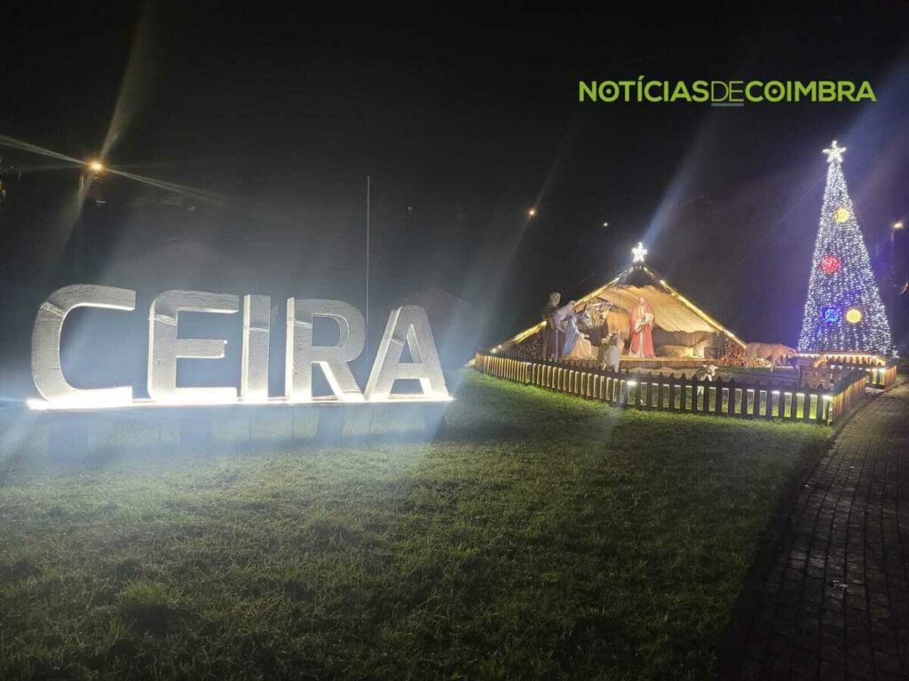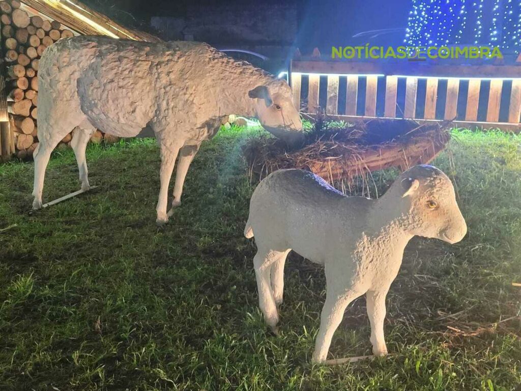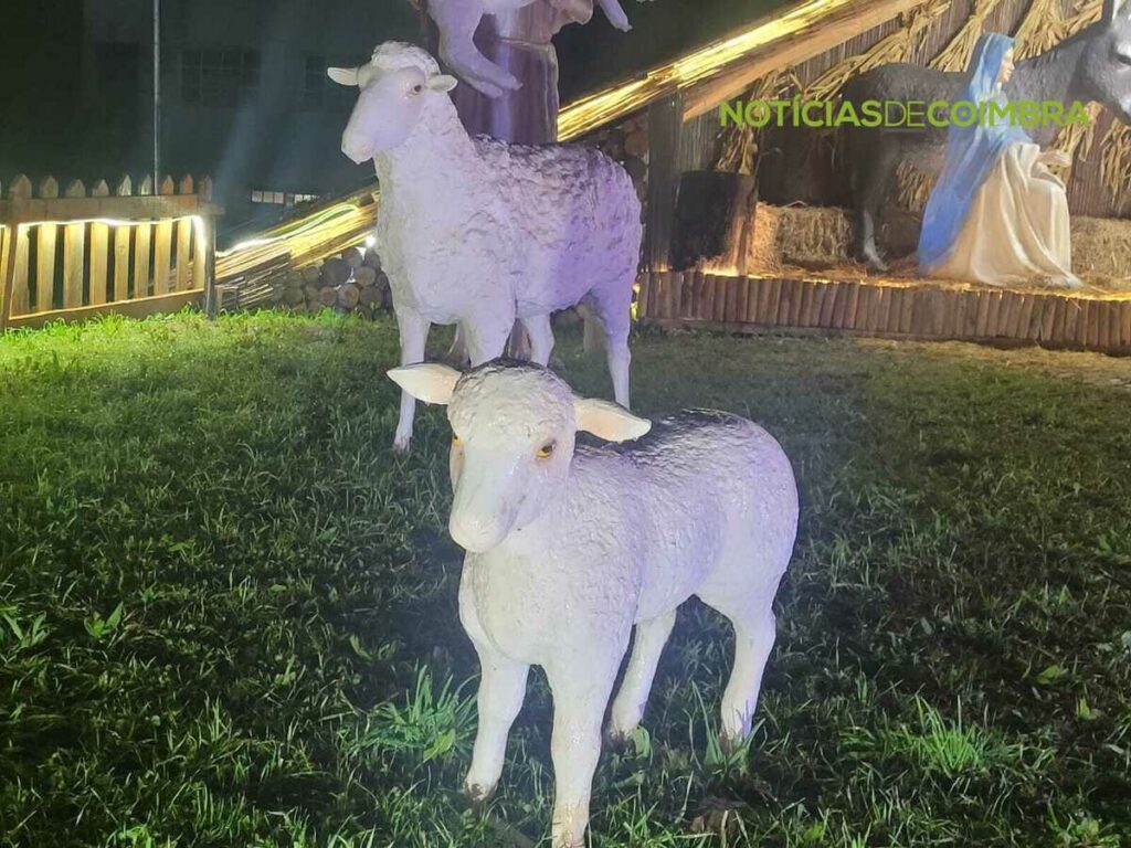 Para além desta composição central, quem visita o espaço encontra ainda uma árvore de Natal iluminada, que complementa o ambiente festivo, e uma inscrição luminosa com o nome da localidade – “Ceira”. No jardim adjacente ao presépio, há também pequenas ovelhas decorativas, que enriquecem o cenário.