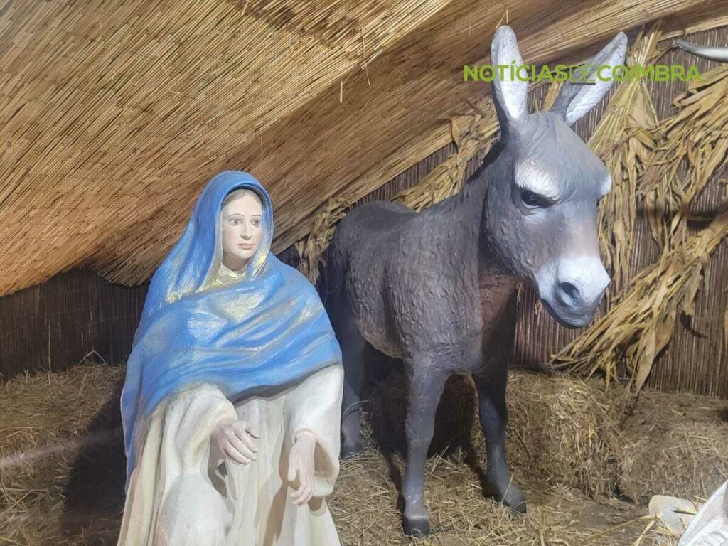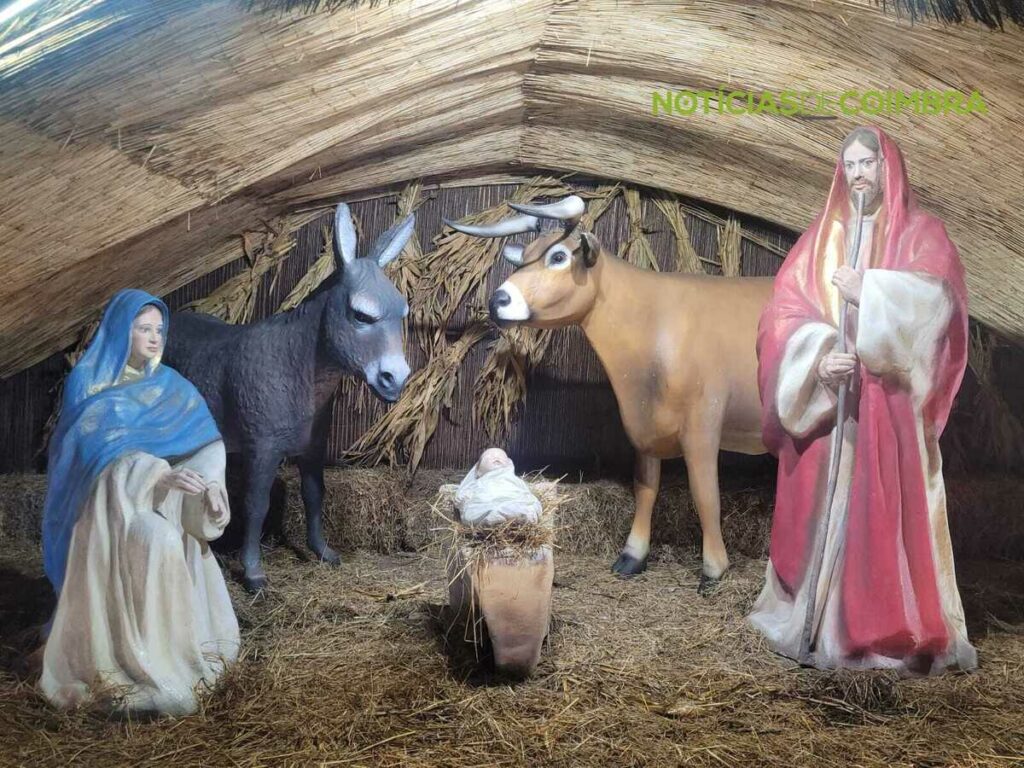 Nas imagens, destacam-se uma representação tradicional do nascimento de Jesus: figuras de Maria e José, ambas em tamanho real, estão com o Menino Jesus deitado numa manjedoura. Ao lado, encontram-se também o burro e a vaca, elementos icónicos deste cenário bíblico. A construção está inserida numa estrutura rústica, feita de palha e madeira, reforçando o ambiente simples e acolhedor característico da narrativa do presépio.