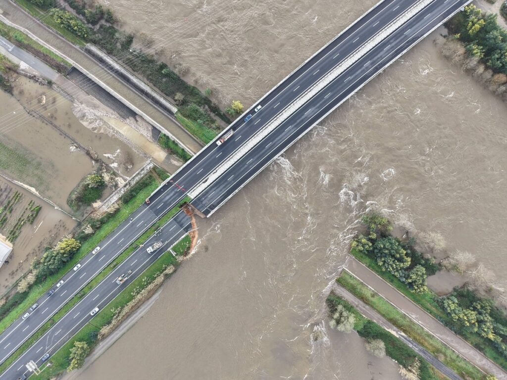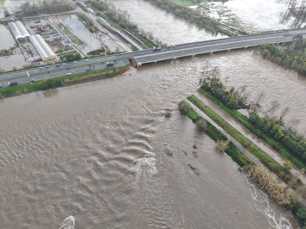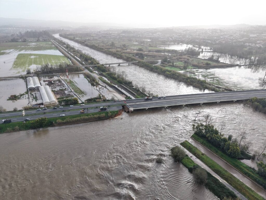Fonte do Comando Geral da GNR confirmou à Lusa danos na plataforma da A1, na zona junto ao local onde o dique rebentou em Casais, na margem direita do Mondego, ao quilómetro 191.