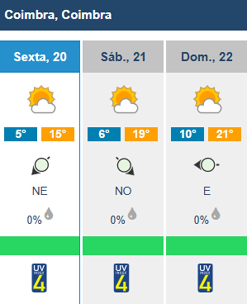 O tempo vai manter-se estável em Coimbra entre sexta-feira, dia 20, e domingo, dia 22, segundo as previsões do Instituto Português do Mar e da Atmosfera (IPMA).