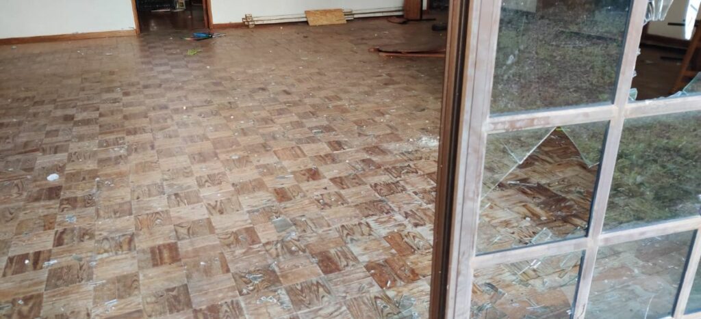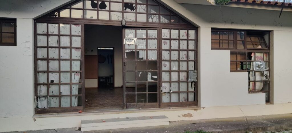 O espaço sofreu danos significativos, incluindo vidros partidos, deixando claro o desrespeito por um bem público.