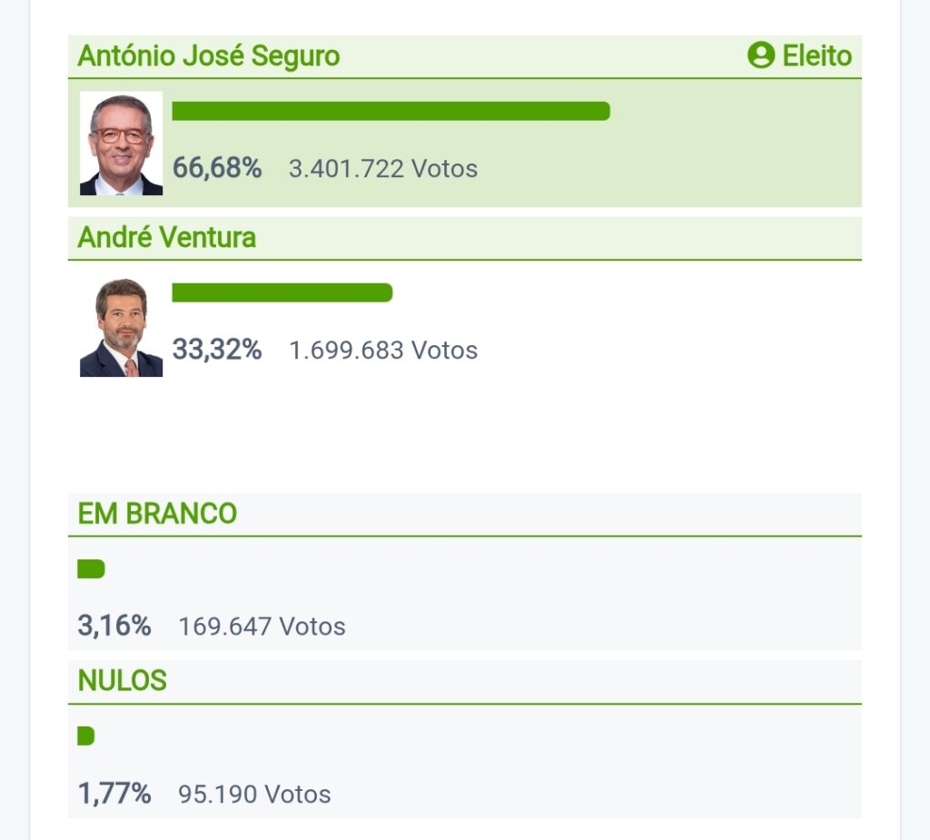 Pelas 21:38, 3.401.722 milhões de portugueses votaram em António José Seguro. Ainda faltam apurar algumas freguesias, mas a vitória é inequívoca uma vez que já tem a maioria absoluta.