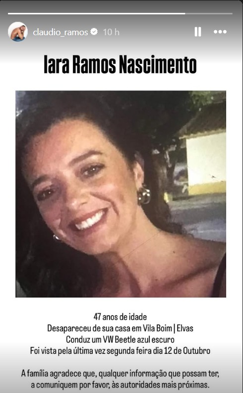 A irmã do apresentador da TVI, Cláudio Ramos, está desaparecida há uma semana. De acordo com publicação feita na sua página da rede social Instagram, Iara Ramos Nascimento tem 47 anos, é cabeleireira de profissão e perdeu o marido, de forma inesperada, há 3 anos.