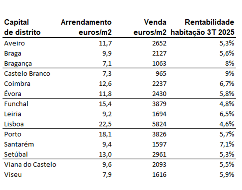 Na análise por capitais de distrito e regiões autónomas, Castelo Branco destaca-se como o mercado mais atrativo para investir em habitação, com uma rentabilidade bruta de 9%. Bragança surge em segundo lugar (8%), seguida de Santarém (7,1%), Coimbra (6,7%), Leiria (6,5%), Viseu (5,9%), Évora (5,8%), Porto (5,7%), Braga (5,6%), Viana do Castelo (5,5%), Aveiro (5,3%) e Setúbal (5,3%).