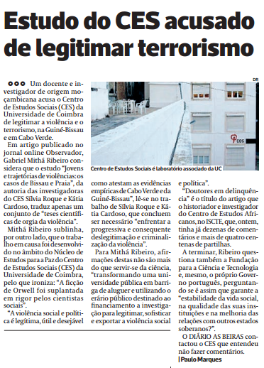 A direcção do Centro de Estudos Sociais emitiu um comunicado onde afirma que “o Diário As Beiras publicou na edição de 28.1.2015 um artigo assinado por Paulo Marques intitulado “Estudo do CES acusado de legitimar o terrorismo”, que dá “voz a um texto de opinião de Mithá Ribeiro (MR) no Observador que acusa um livro organizado por três investigadores do CES (José Manuel Pureza, Katia Cardoso e Sílvia Roque), que tem como autores oito investigadores de quatro instituições diferentes, de ser um repositório de “teses científicas de orgia da violência”.