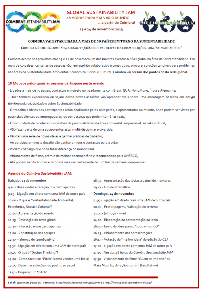 Coimbra acolhe nos próximos dias 23 e 24 de novembro um dos maiores eventos a nível global na área da Sustentabilidade. Nesse fim de semana, em simultâneo em mais de 50 países, centenas de pessoas vão, em espírito colaborativo e construtivo, procurar soluções tangíveis para problemas nas áreas da Sustentabilidade Ambiental, Económica, Social e Cultural.