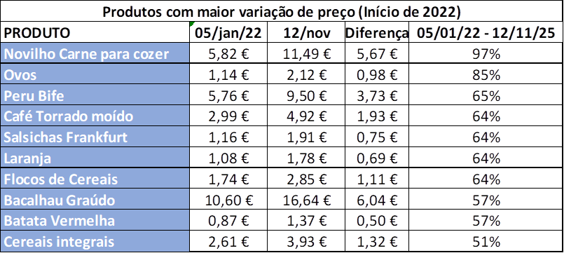 • Entre o dia 05/01/22 e o dia 12/11/25 existe uma diferença de 57,25€ quando comparado o mesmo cabaz nos 2 dias (30,5 %).