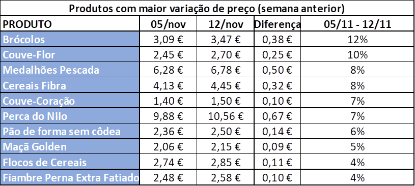 Os produtos com maior variação de preços face à semana anterior, desde o início do ano, face ao período homólogo e desde o início da análise, foram os seguintes: