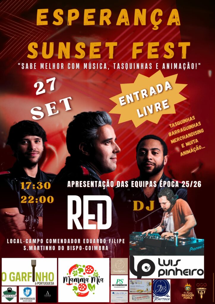 O Campo Comendador Eduardo Filipe vai receber, no dia 27 de setembro, das 17:30 às 22:00, o Esperança Sunset Fest, um evento que combina a emoção do futebol com a animação de um pôr do sol em festa.