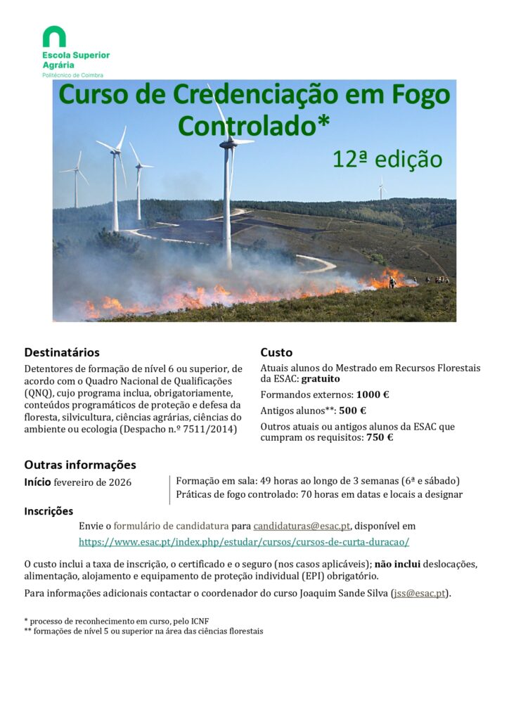 Encontram-se abertas, até ao próximo dia 6 de fevereiro, as inscrições para a 12.ª edição do curso de credenciação em fogo controlado a ser lecionado pela Escola Superior Agrária do Politécnico de Coimbra (ESAC-IPC).