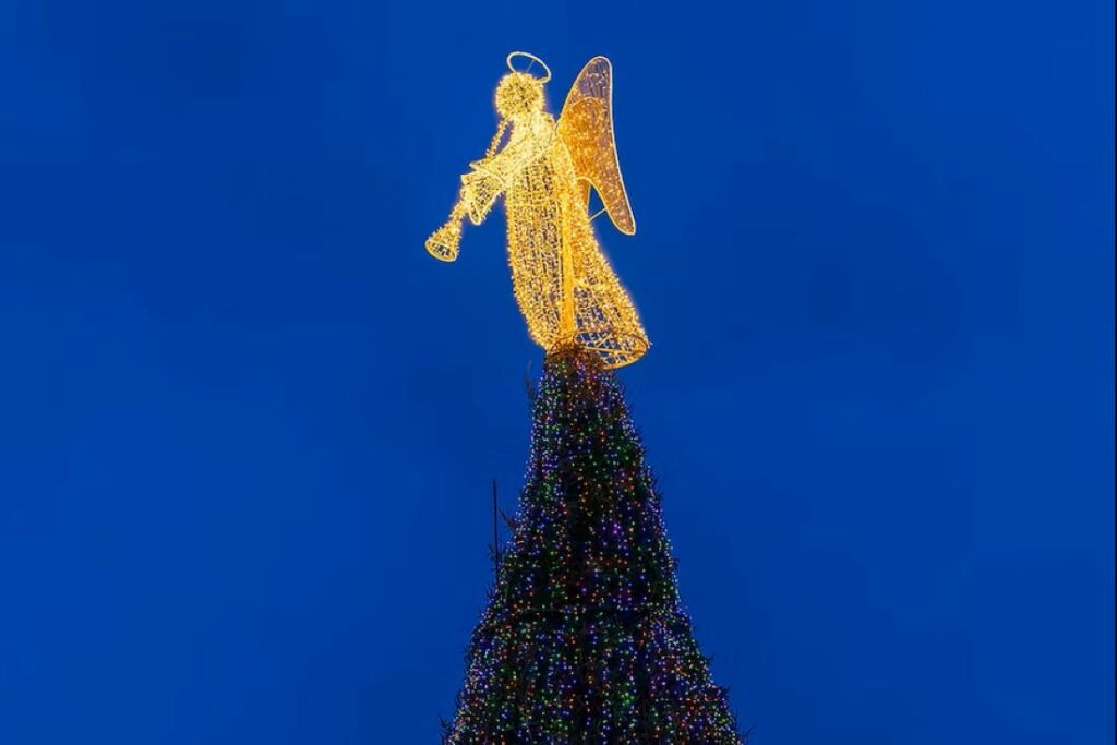 Um dos detalhes que não passa despercebido é o topo: em vez da tradicional estrela, a árvore é coroada por um anjo de quatro metros, tornando-se num verdadeiro símbolo fotográfico.