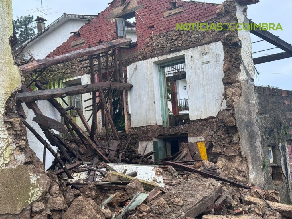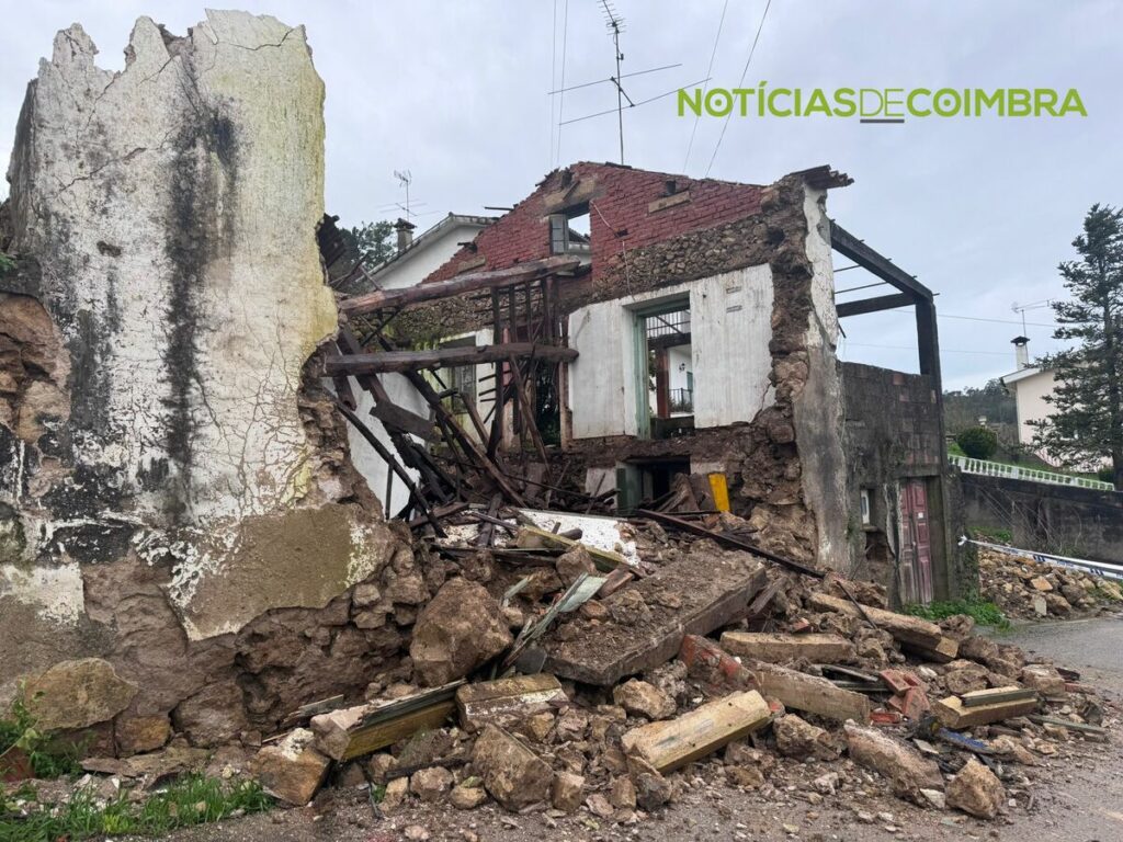 Destruição. Fachada de casa desaba e bloqueia estrada em Coimbra