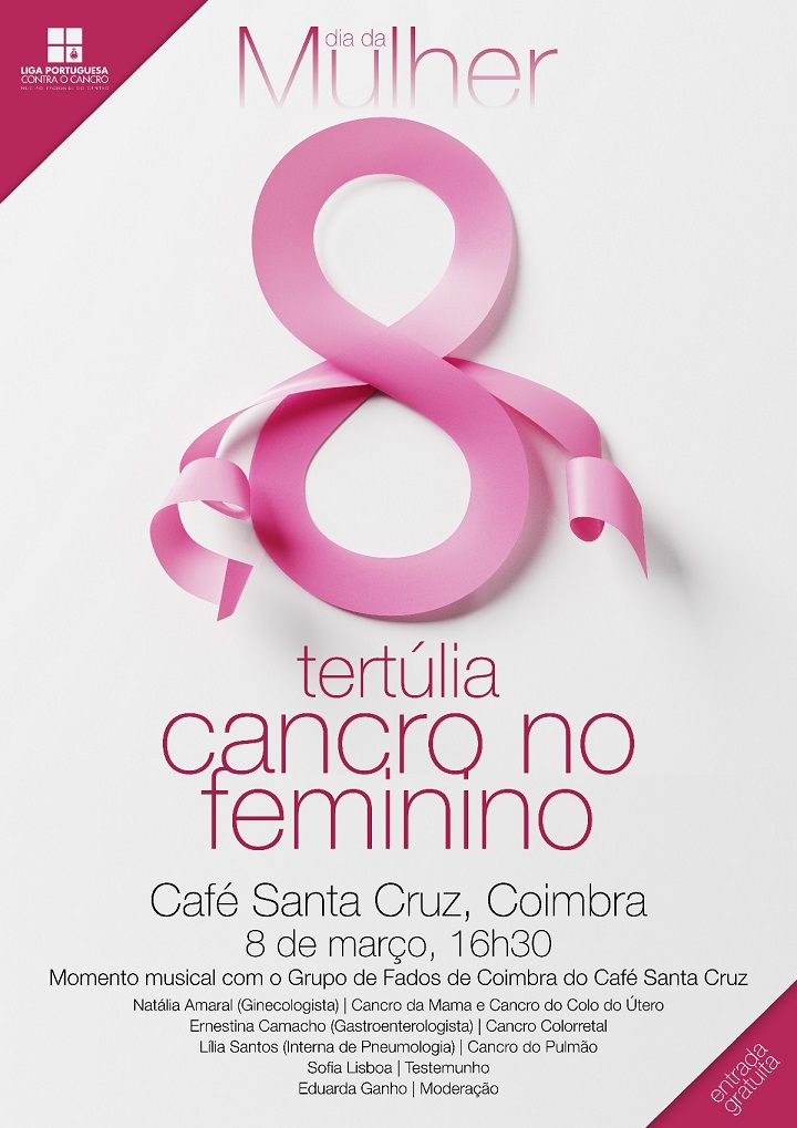 O Núcleo Regional do Centro da Liga Portuguesa Contra o Cancro (LPCC.NRC) organiza na sexta-feira (8 março), pelas 16h30, no café Santa Cruz, uma tertúlia com o tema “Cancro no Feminino”, onde o mote serão as mulheres e a reflexão aberta sobre os tipos de cancro mais frequentes na mulher, fatores de risco para cada um deles e como a mulher pode proteger-se.