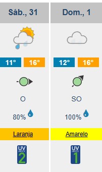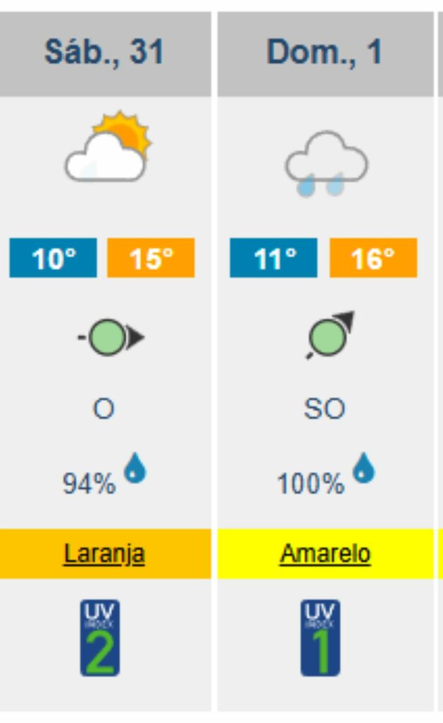 Na Figueira da Foz, a situação é semelhante, com 80% de probabilidade de chuva no sábado e 100% no domingo. As temperaturas devem variar entre 11ºC e 16ºC no sábado, mantendo-se estáveis no domingo, com mínimas de 12ºC e máximas de 16ºC.