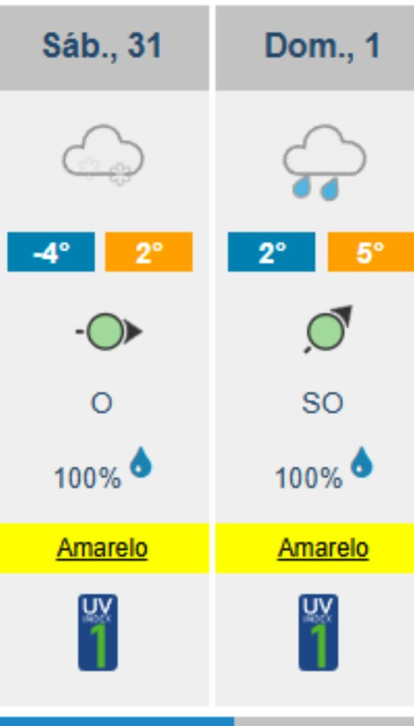 Já na Serra da Estrela, o frio será mais intenso. Sábado apresenta máximas de 2ºC e mínimas de -4ºC, enquanto domingo deverá registar máximas de 5ºC e mínimas de 2ºC.