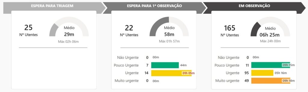 Quando se passa para o ítem Em Observação, os 165 utentes inscritos no Serviço de Urgências da ULS Coimbra têm um tempo médio de espera de 6 horas e 25 minutos. Os 49 doentes muito urgentes registavam a esta hora uma espera média de 9 horas e 18 minutos, logo seguido dos doentes pouco urgentes com um tempo médio de 9 horas e 15 minutos e os doentes urgentes com uma média de 5 horas e 16 minutos.