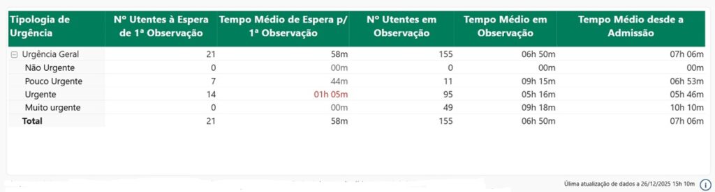 O dia 26 de dezembro está a ser algo caótica no serviço de urgências da ULS Coimbra (Hospitais da Universidade de Coimbra). Às 15:10, e de acordo com a página da Internet do Serviço Nacional de Saúde (SNS), havia 25 utentes à espera de serem triados, sendo o tempo médio de atendimento de 29 minutos.