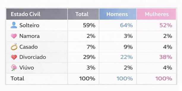 O perfil mais representativo situa-se em torno dos 40 anos, sendo maioritariamente composto por pessoas solteiras (59%), seguidas de divorciadas (29%). Enquanto os homens predominam entre os solteiros, são as mulheres que lideram entre os utilizadores divorciados.