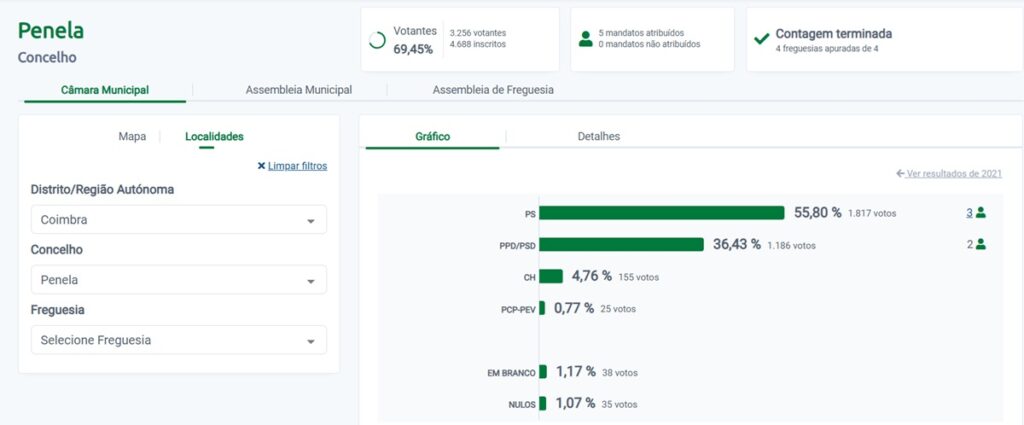 O Partido Socialista (PS) conquistou a Câmara Municipal de Penela, alcançando 55,80% dos votos (1.817 sufrágios) .