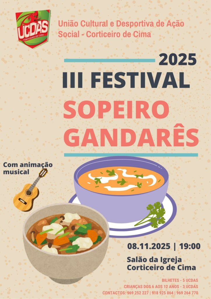 A União Cultural e Desportiva de Ação Social (UCDAS) de Corticeiro de Cima, no concelho de Cantanhede, vai organizar, no dia 8 de novembro, o III Festival Sopeiro Gandarês, um evento que promete uma noite de confraternização, cultura e música na freguesia.