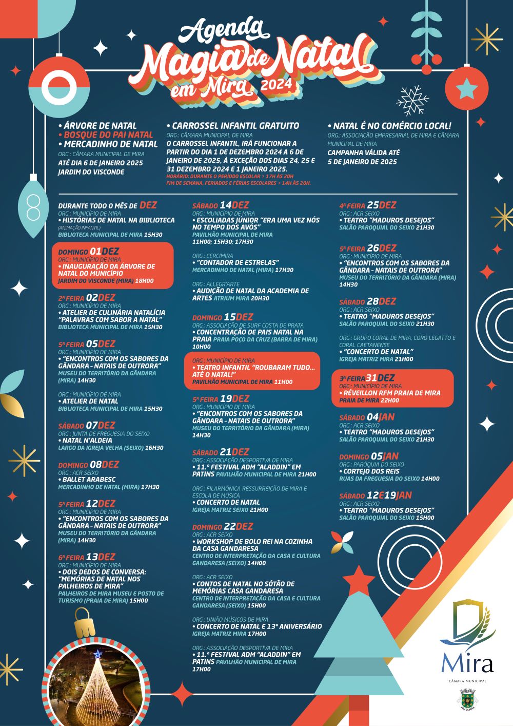 O Município de Mira, em parceria com as Juntas de Freguesia e as Associações do concelho, preparou um vasto programa de atividades para assinalar a quadra natalícia, que se estende até ao dia 6 de janeiro de 2025.
