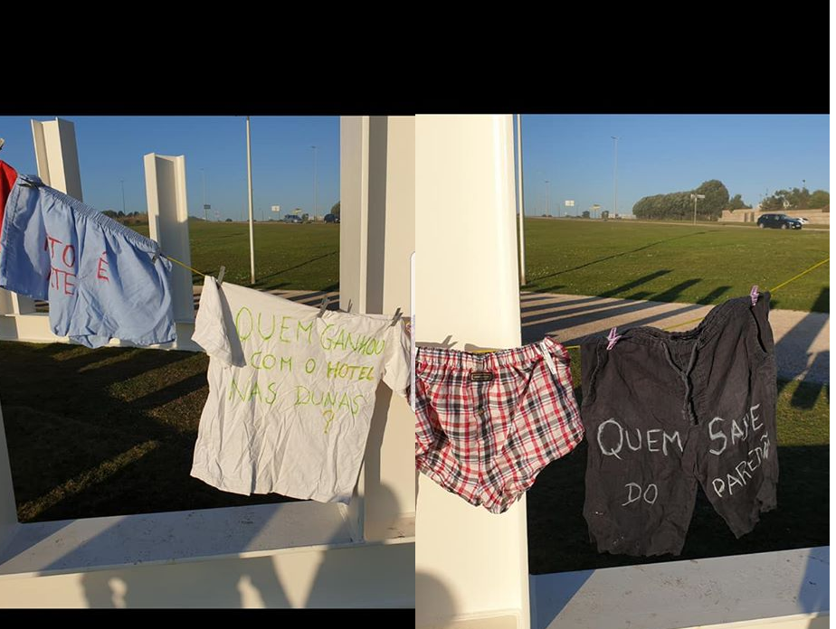 Nas fotos do “estendal” publicadas na página pessoal de Facebook de Pedro Almeida veem-se numa corda t-shirts, calções e bóxeres onde se leem as perguntas “Quem sabe do paredão?”, referindo-se ao prolongamento do quebra-mar do Porto de Leixões que tem gerado contestação, “Quem ganhou com o hotel nas dunas?”, fazendo menção à construção de um hotel na Praia da Memória que tem causado indignação, e “Os quatro milhões de euros da Realidade Social?”, numa alusão à obra de construção de um centro de cuidados continuados que nunca foi acabada.