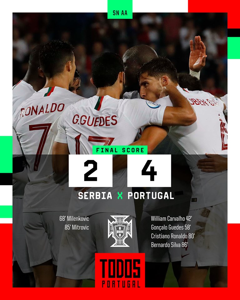 Depois dos empates caseiros com a Ucrânia (0-0) e os sérvios (1-1), os campeões europeus em título venceram com tentos de William Carvalho, aos 42 minutos, Gonçalo Guedes, aos 58, Cristiano Ronaldo, aos 80, e Bernardo Silva, aos 86.