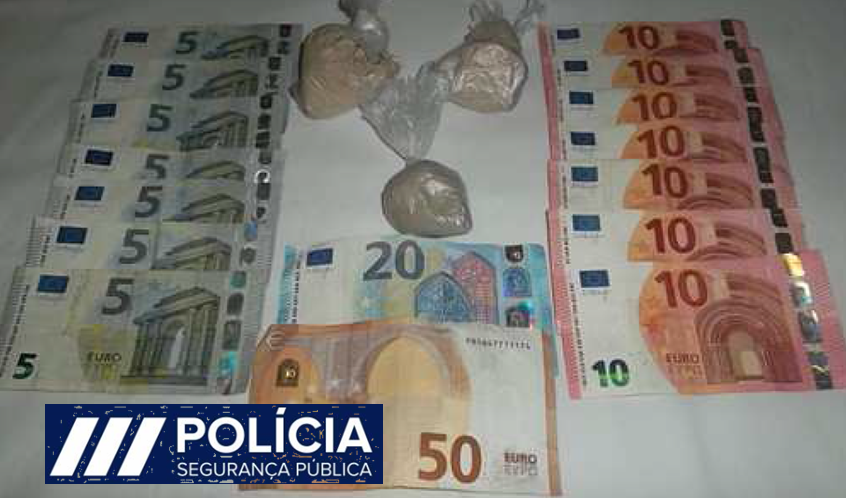 Segundo a PSP, “pelas 08H30, o mesmo foi intercetado à saída da sua residência. Sujeito a uma revista de segurança, foi-lhe encontrado no interior de um bolso de um casaco um saco em plástico, que continha duas embalagens com um produto suspeito de ser estupefaciente e uma outra embalagem que continha um produto cinzento, normalmente utilizado para adulterar o estupefaciente, aumentado a sua quantidade e um maço de Notas do Banco Central Europeu, que se supõe ser proveniente da atividade ilícita”.