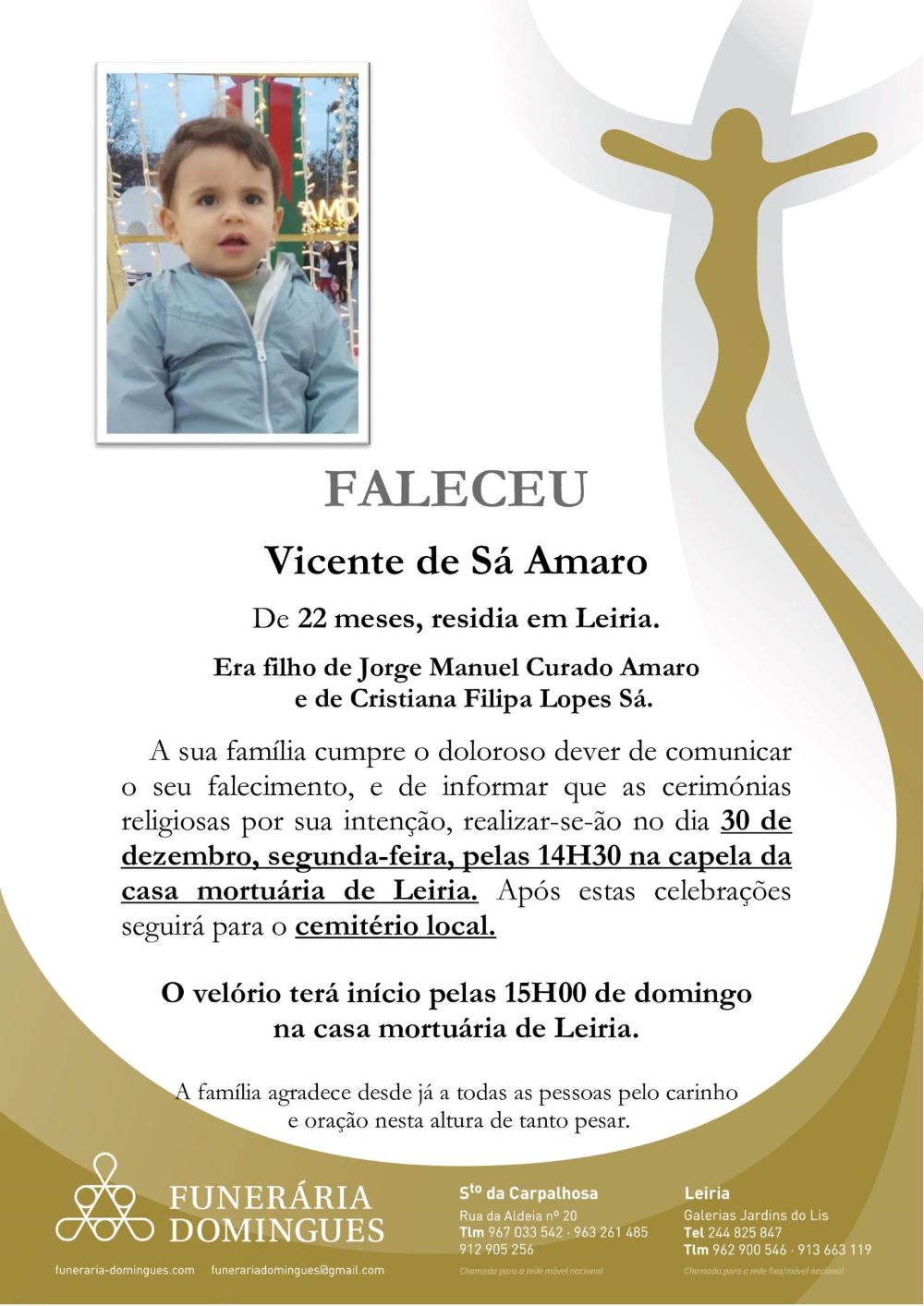 O corpo de Vicente de Sá Amaro estará na Casa Mortuária de Leiria a partir das 15:00 deste domingo, 29 de dezembro.