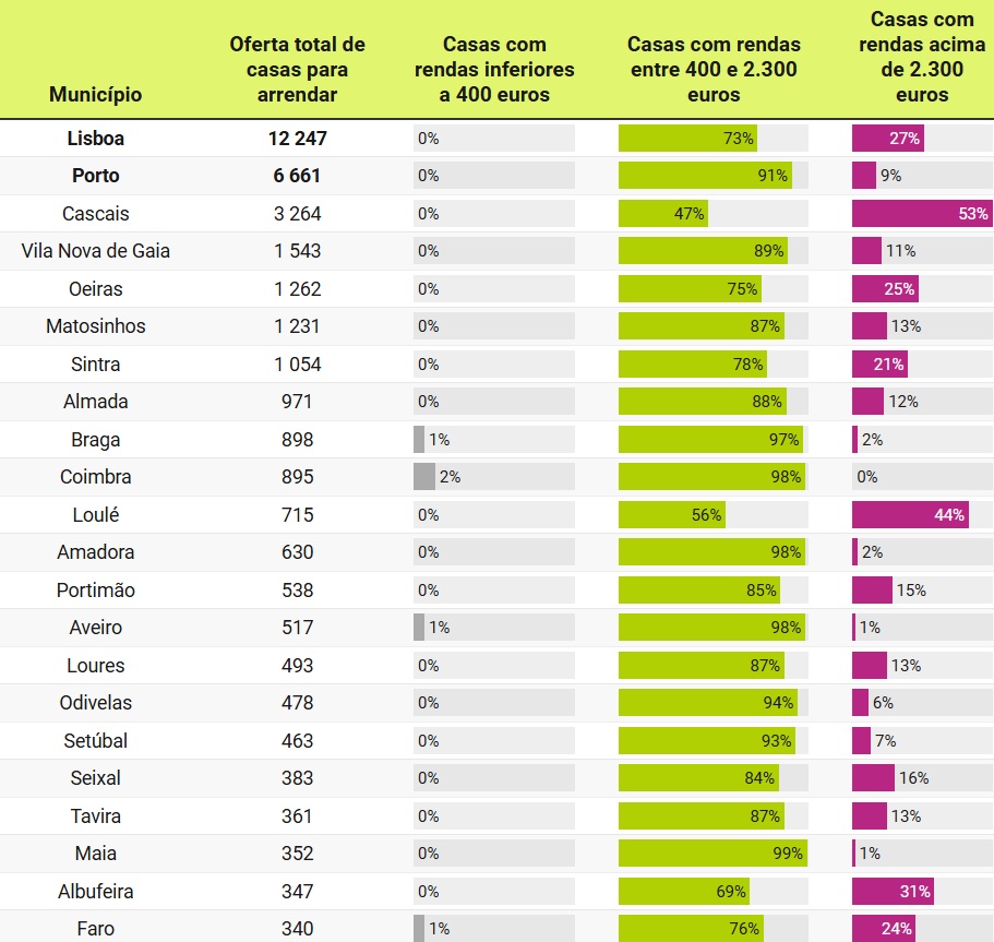 Aliás, verifica-se que praticamente todos os municípios em análise possuem mais de metade das casas para arrendar dentro do intervalo de preços moderados – e com direito a benefícios fiscais para senhorios. É o caso da capital (73% do stock do concelho), do município da Invicta (91%) e de Gaia (89%). A Figueira da Foz está em destaque, uma vez que todas as 233 casas no mercado de arrendamento têm rendas moderadas.