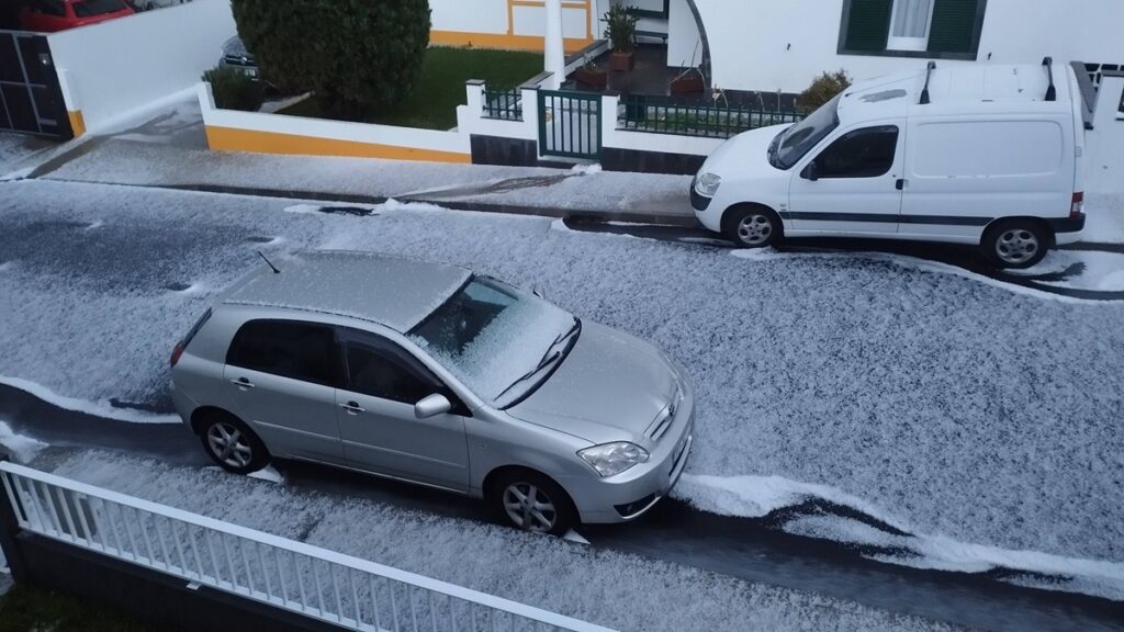 Publicações mostram ruas, carros e campos momentaneamente cobertos de gelo, num cenário pouco comum para esta altura do ano. Muitos utilizadores descrevem o episódio como “inesperado” e “fora de época”, destacando a intensidade dos aguaceiros acompanhados de trovoada.
