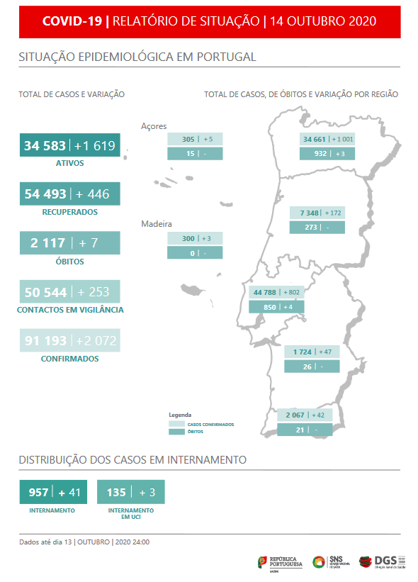 Hoje os dados da DGS dão conta da notificação de 2.072 novos casos nas últimas 24 horas, número recorde, e do registo de sete mortos, assim como de um continuo aumento do número de internamentos, que passaram para 957 (mais 41) e 135 em cuidados intensivos (mais três).