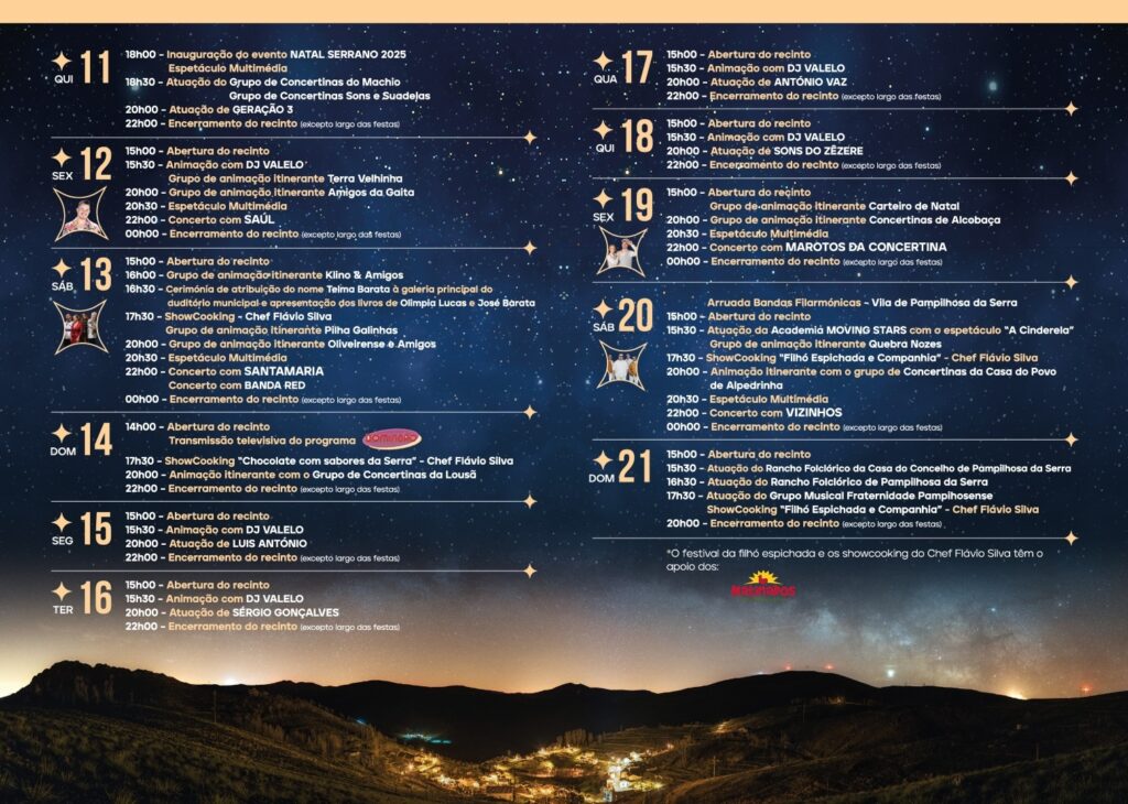 O programa do Natal Serrano está completo e a magia da época regressa a Pampilhosa da Serra de 11 a 21 de dezembro, num evento que resgata a autenticidade das tradições serranas e convida a viver a quadra natalícia com o aconchego de outros tempos.