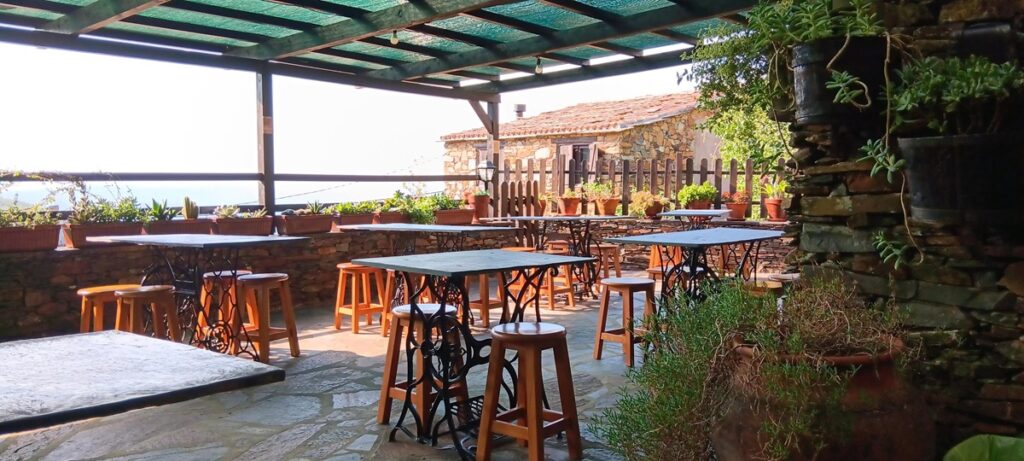No teto estão penduradas folhas de papel e notas, lembranças de quem já esteve ali, enquanto a zona de esplanada oferece uma vista deslumbrante sobre a Serra da Lousã, perfeita para uma pausa na tranquilidade da natureza.
