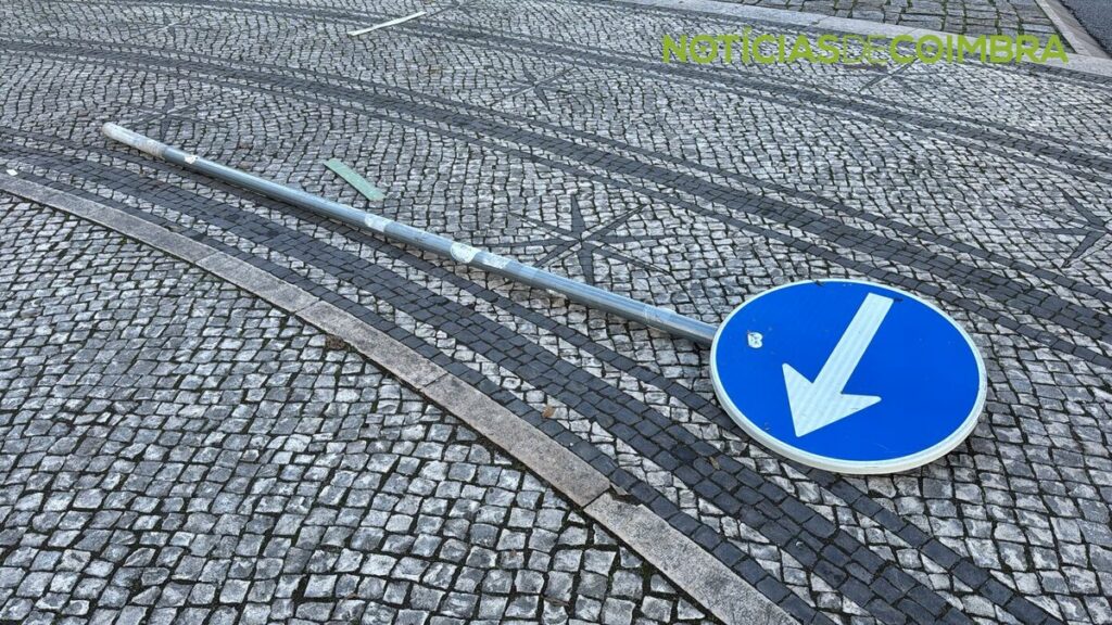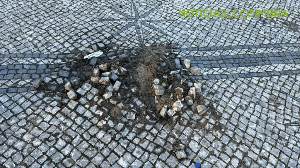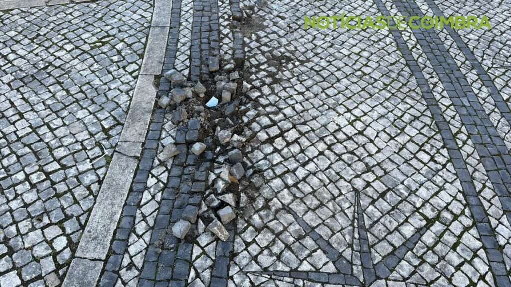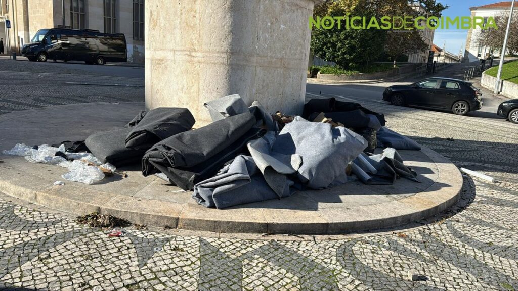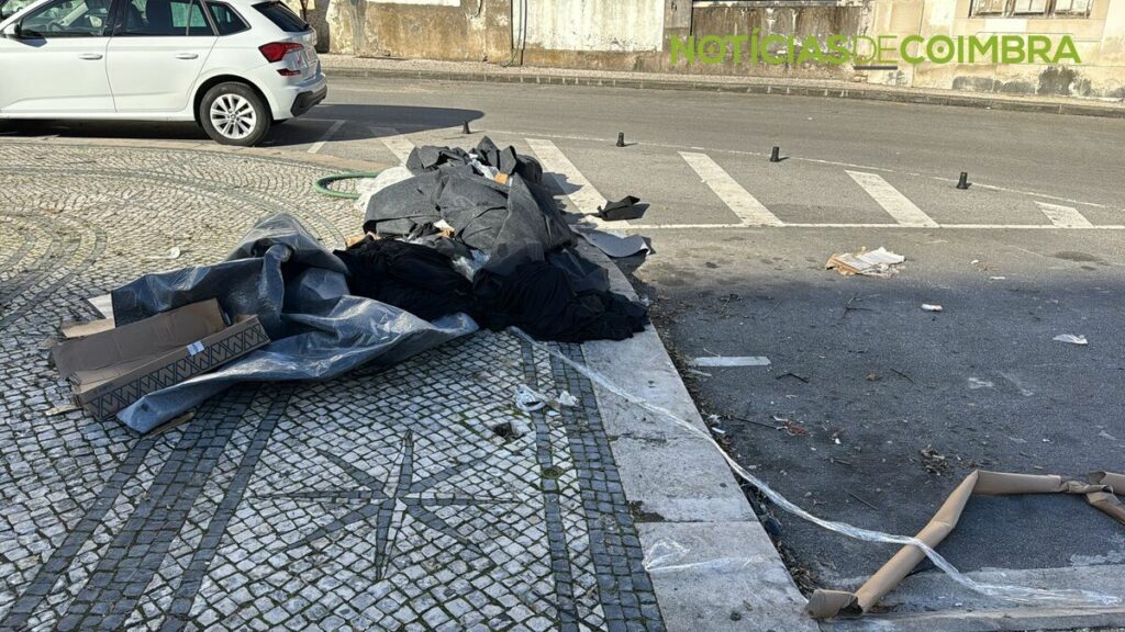 O Largo D. Dinis, um dos locais mais emblemáticos de Coimbra, apresenta atualmente lixo acumulado, um sinal de trânsito caído e danos visíveis no pavimento.