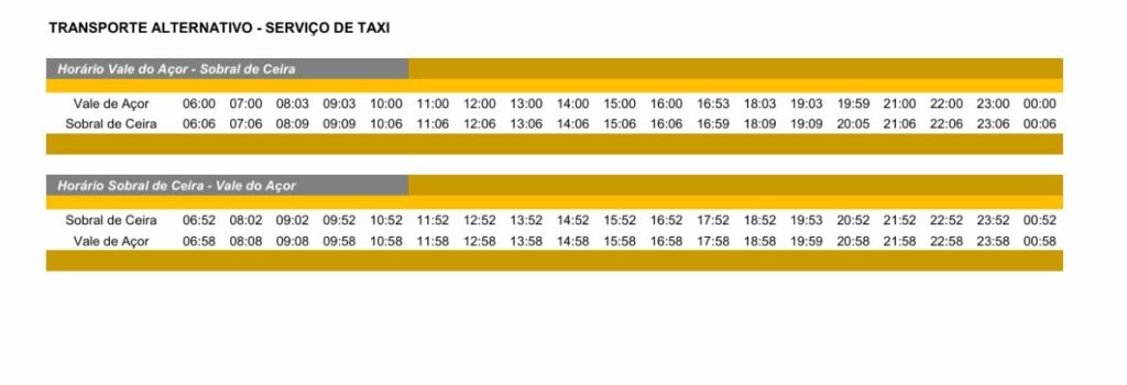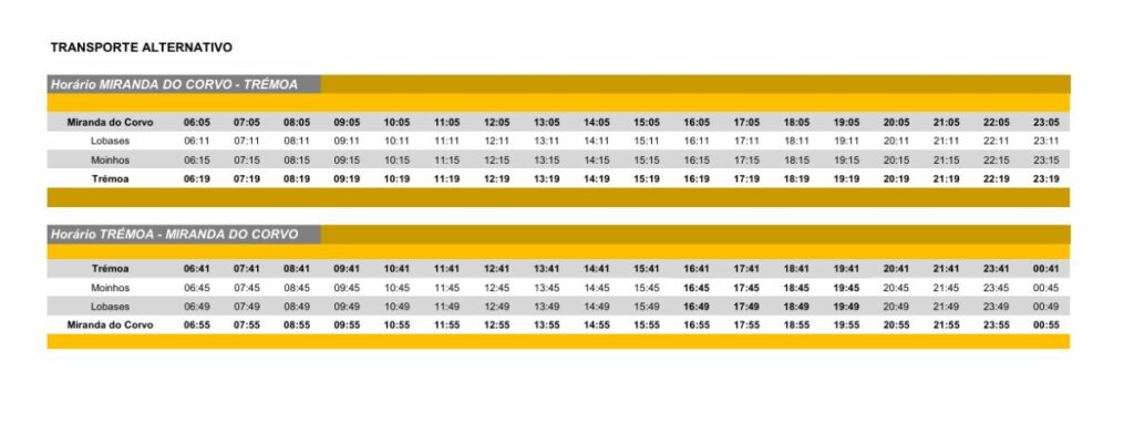 Adicionalmente está a proceder à contratualização do serviço alternativo para este período. Neste quadro, as ligações entre Sobral de Ceira e Serpins (em ambos os sentidos) serão efetuadas por um serviço de transporte alternativo, cujos horários se apresentam em anexo, os quais se encontram também disponíveis nas redes sociais e website da MM.