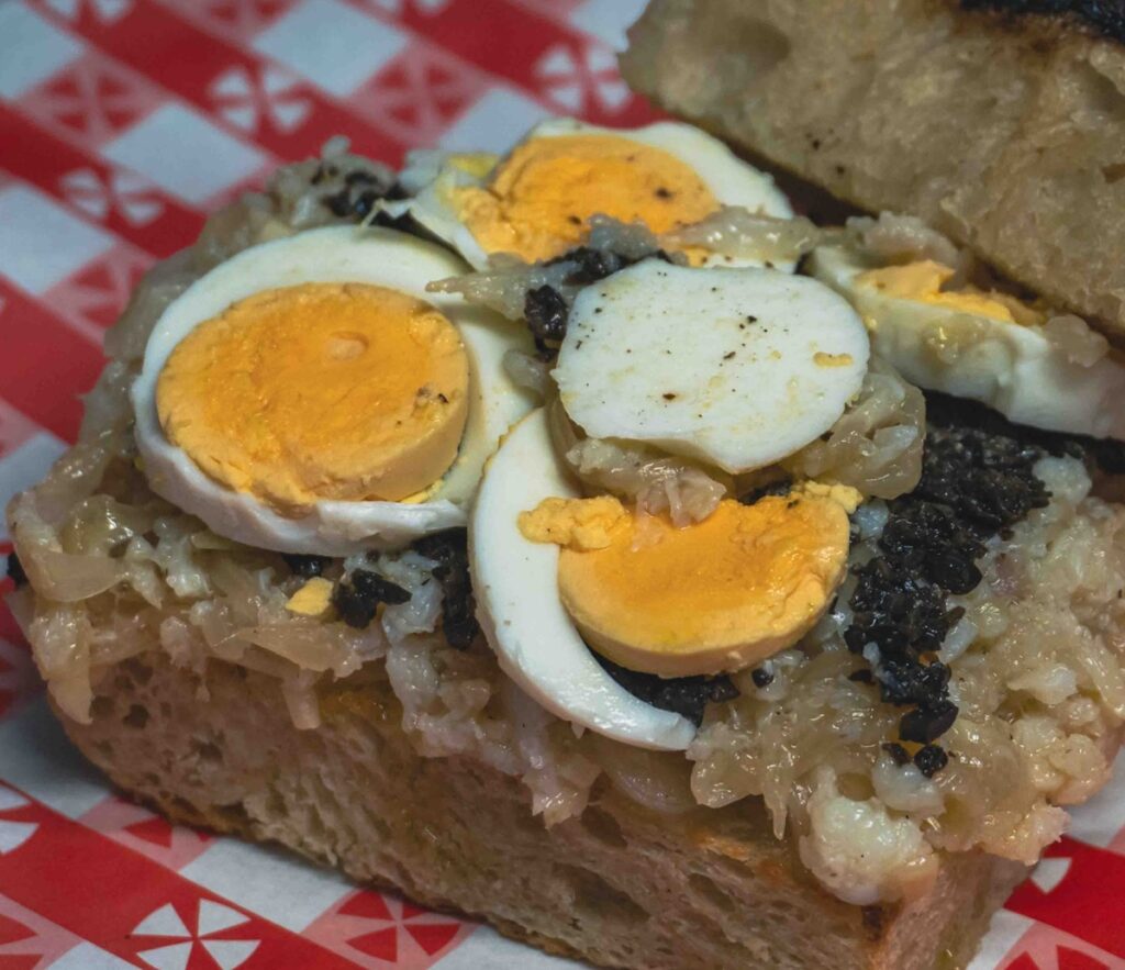 O menu inclui entradas como pão de queijo; focaccias desde 1,85€ (simples) até 10 euros (de bacalhau); pizzas entre 8 e 14 euros; e sobremesas como pão de massa doce e amanteigada com cobertura de banana, doce de leite e crumble.