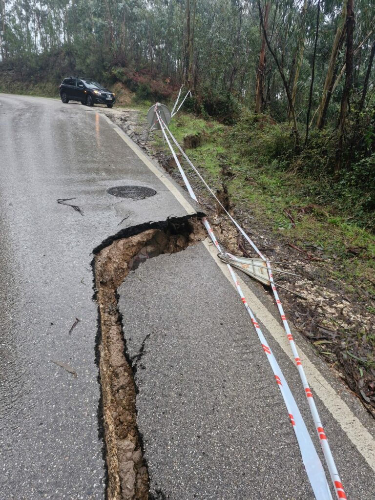 O volume excessivo de água acumulada, junto com a instabilidade do terreno, tem levado à cedência parcial de uma via na zona de Rocha Velha — com o pavimento a dar sinais de abate e risco elevado de colapso, o que aconteceu, como se pode ver nas imagens.