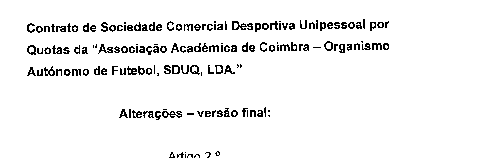 Notícias de Coimbra antecipa a divulgação na integra das alterações introduzidas no contrato de sociedade da Associação Académica de Coimbra – Organismo Autónomo de Futebol, SDUQ, Lda, documento que vai ser apresentado aos sócios da AAC/OAF na próxima terça-feira.