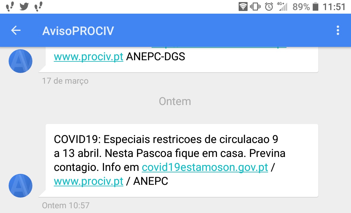 “COVID19: Especiais restrições de circulação 9 a 13 abril. Nesta Pascoa fique em casa. Previna contagio. Info em covid19estamoson.gov.pt / www.prociv.pt / ANEPC”, foi o conteúdo do SMS recebido em português e em inglês.