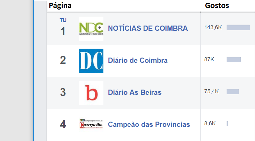 Notícias de Coimbra está em 1º lugares com 143 000 “Fãs”. É seguido pelo Diário de Coimbra com com 87 000. As Beiras é 3º com 75 000. O Campeão das Províncias é 4º com uns residuais 8 600 “Likes”.