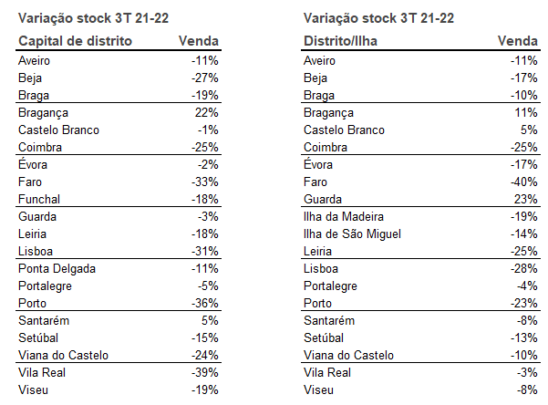 Por outro lado, Bragança, foi a cidade onde mais cresceu a oferta (22%), seguida por Santarém (5%), sendo as duas únicas cidades analisadas onde o “stock” aumentou.