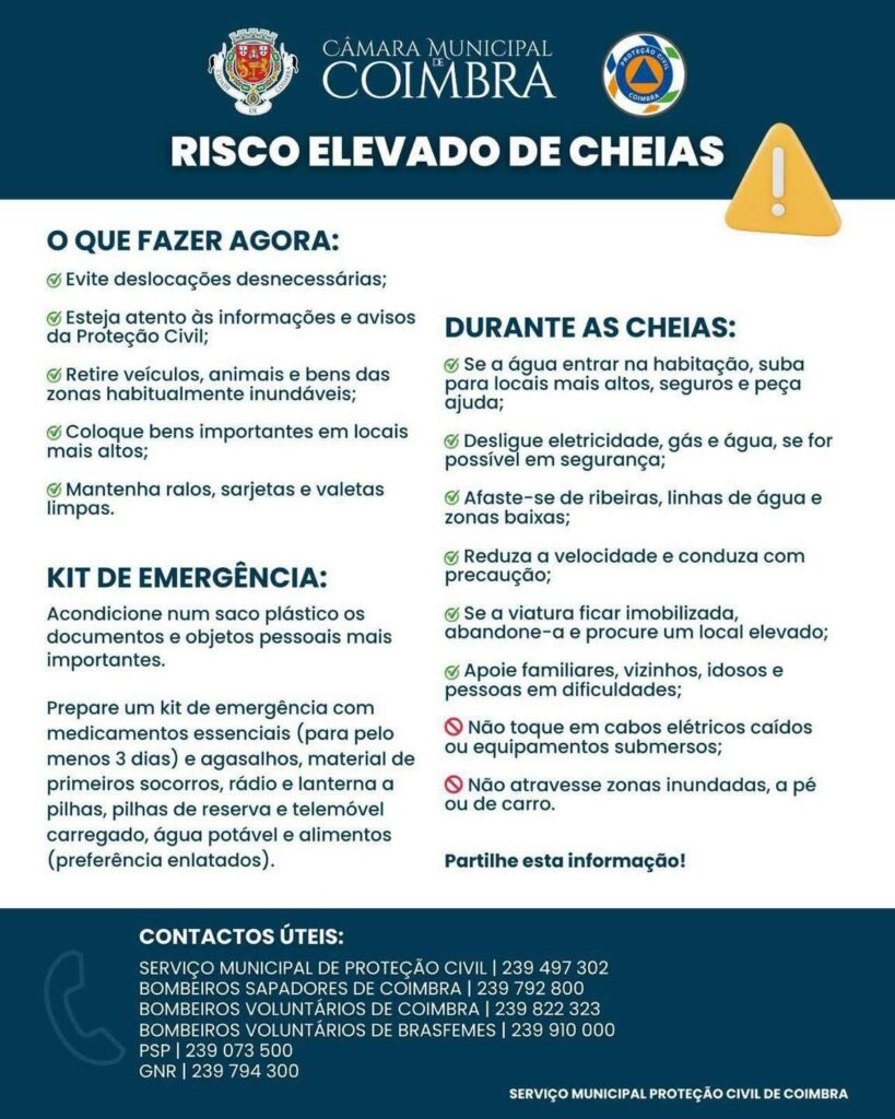 A presidente da Câmara de Coimbra afirmou esta quinta-feira que há a possibilidade de, na manhã de sexta-feira, ocorrer uma cheia centenária na bacia do Mondego, que poderá atingir a Baixa da cidade. De acordo com Ana Abrunhosa, prevê-se um pico de cheia entre as 08:00 e as 09:00 e outro às 15:00. Por este motivo, foi determinado o encerramento de todos os estabelecimentos de ensino, público e privado. A autarca disse também que a Câmara se está a preparar para ter de retirar 9.000 pessoas, sobretudo na zona urbana, e aconselhou as pessoas a terem a terem uma mala com pertences a postos, caso seja necessário.