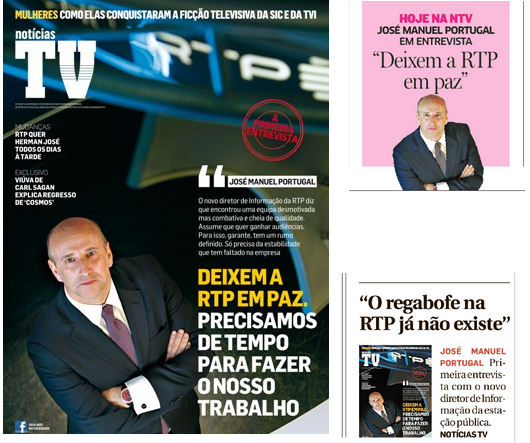 O jornalista de Coimbra aparece em grande destaque na revista distribuída com o JN e DN, com o jornal do Norte a destacar que o “nosso” Portugal quer que “deixem a RTP em Paz” e o diário do Sul a salientar que “O regabofe na RTP já não existe”.