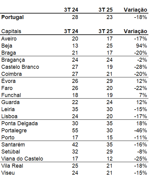 Por outro lado, registaram-se descidas significativas em várias capitais. As que mais caíram foram Portalegre (-46%), Castelo Branco (-28%), Viana do Castelo (-25%), Faro (-22%), Braga (-20%) e Coimbra (-20%).