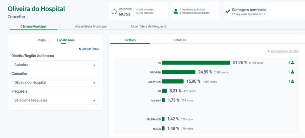 O Partido Socialista (PS) voltou a vencer no concelho de Oliveira do Hospital, alcançando 51,26% dos votos (6.148 sufrágios),