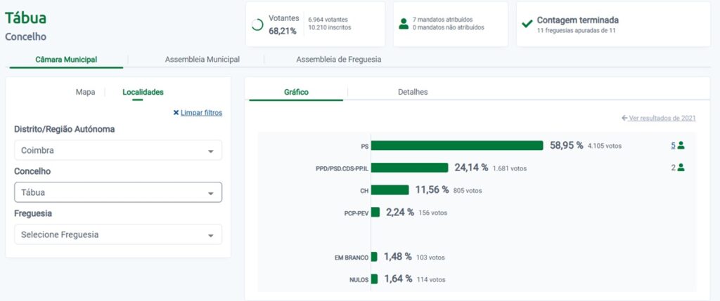 O Partido Socialista (PS) conquistou uma vitória robusta no concelho de Tábua, alcançando 58,95% dos votos.