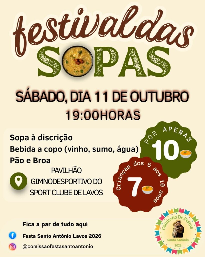No sábado, dia 11 de outubro, o Pavilhão Gimnodesportivo do Sport Clube de Lavos vai encher-se de aromas e sabores no Festival das Sopas, uma iniciativa inserida nas celebrações da Festa de Santo António.